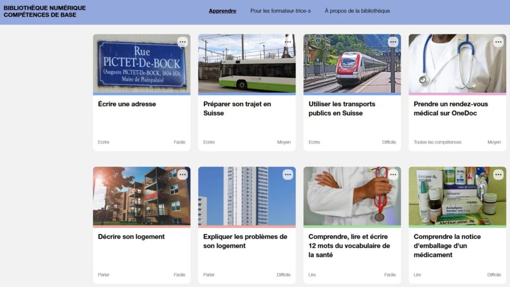 Cette bibliothèque a pour but de promouvoir et de faciliter l’utilisation de contenus d’apprentissage numériques dans l’enseignement des compétences de base. Grâce à un outil de création, les fomateur-trice-s peuvent également créer et adapter leurs propres contenus.